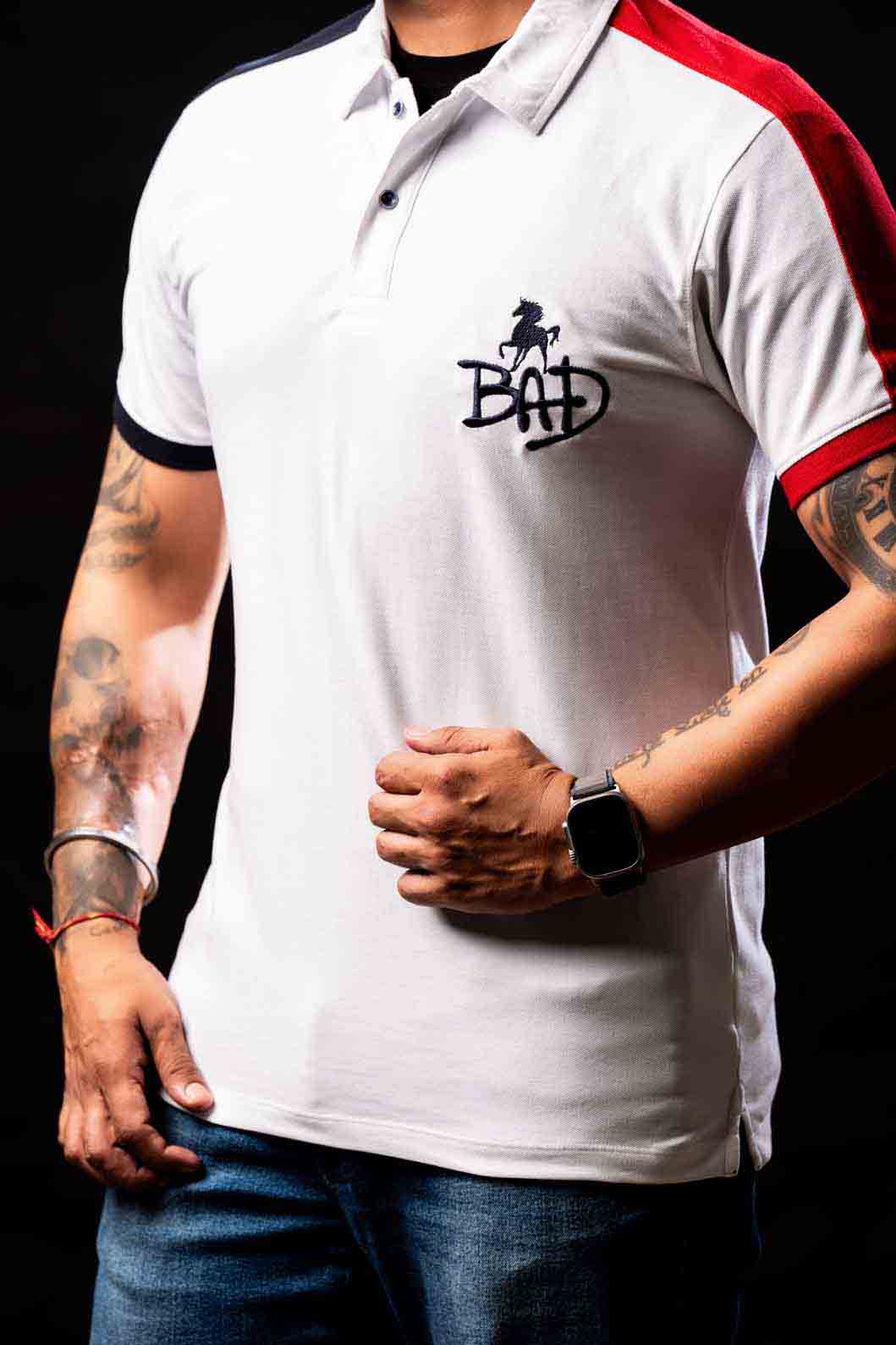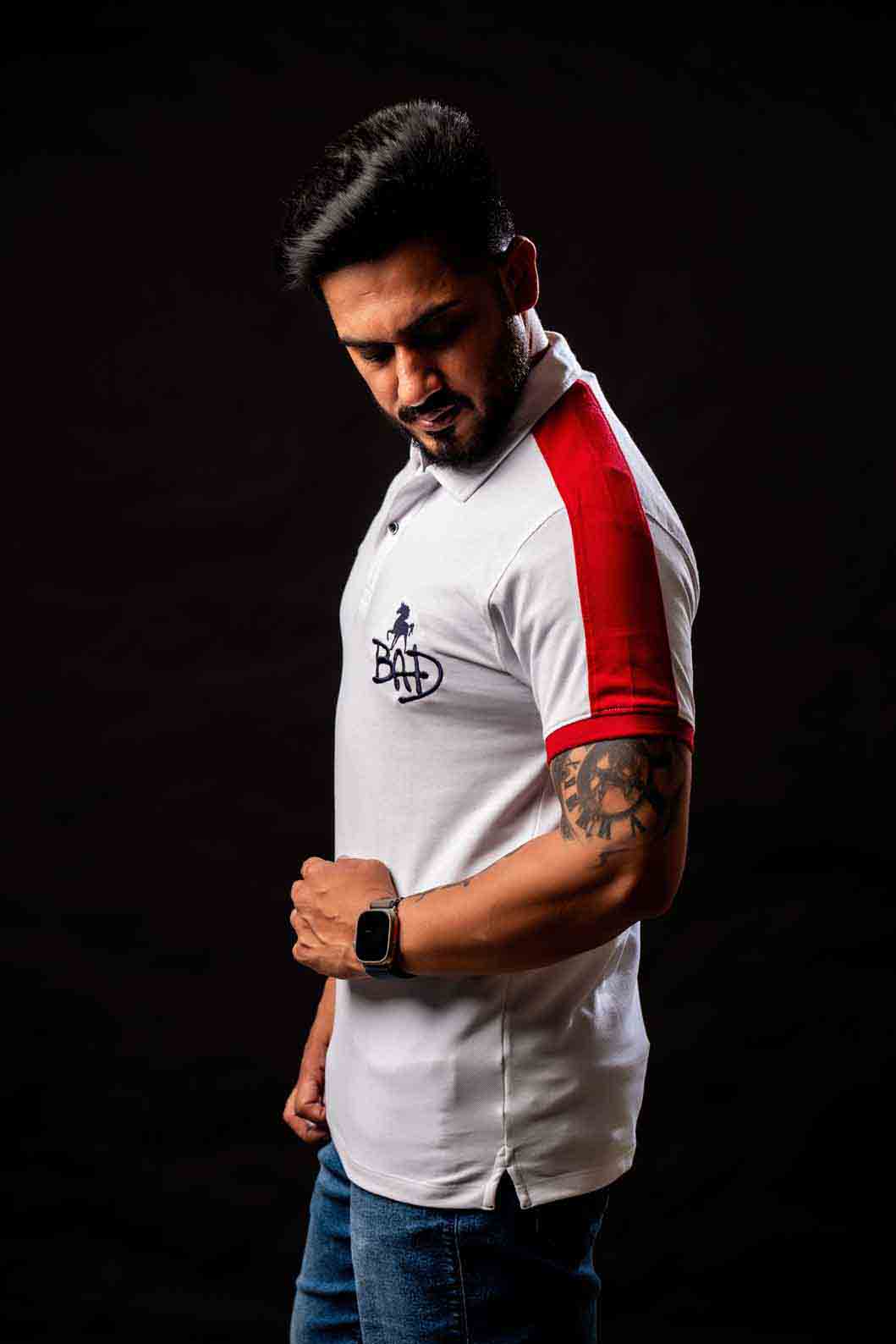 The model (height 6′) is...White-brick navy cotton-poly extra soft hand feed cut and siew t-shirt for men. It will give you an elegant look.