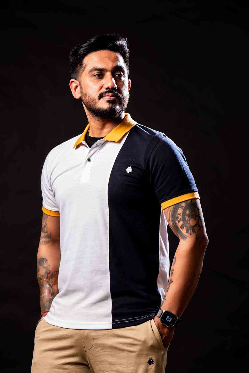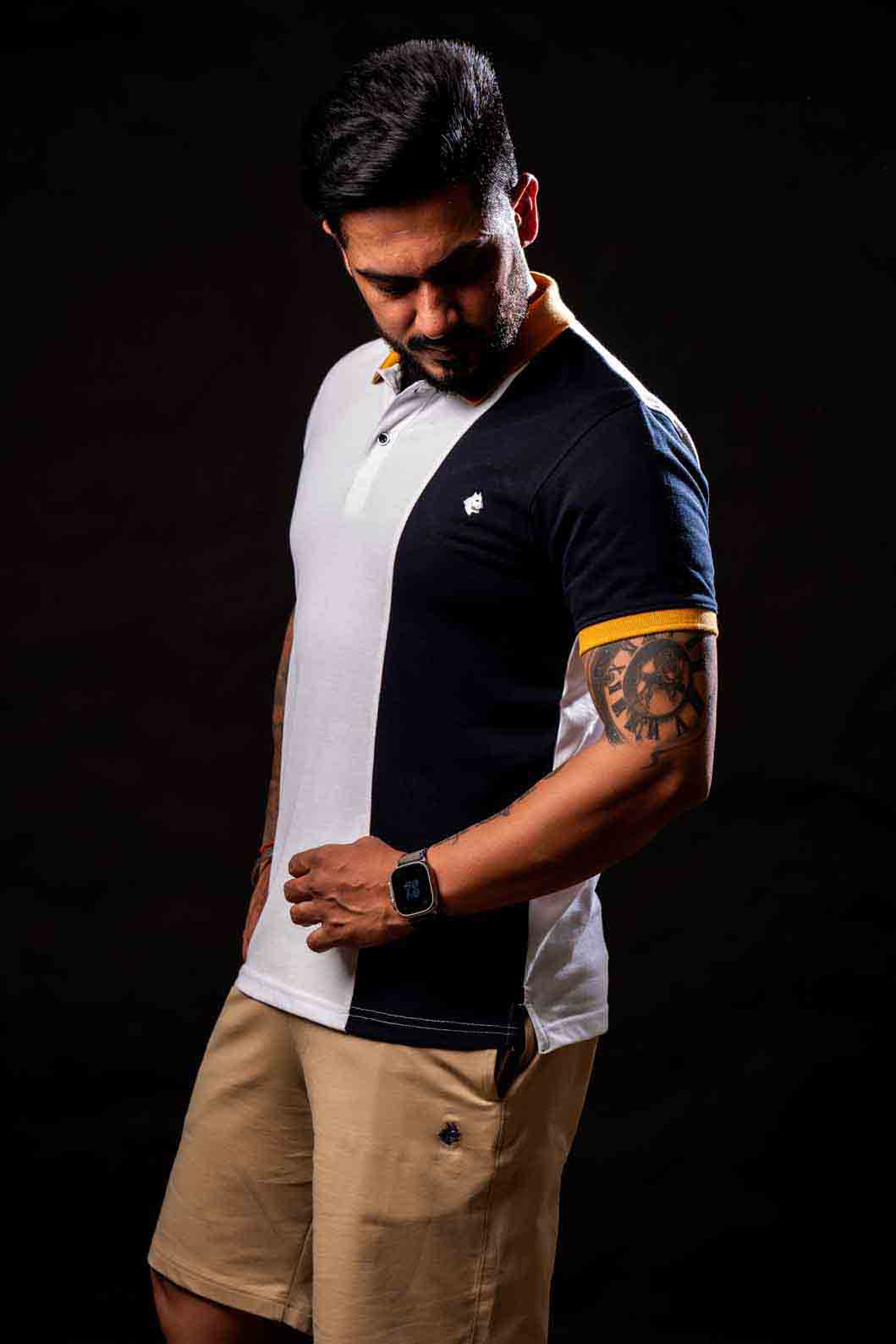 The model (height 6′) is wearin...White-Navy cotton-poly extra soft hand feed cut and siew t-shirt for men. It will give you an elegant look.